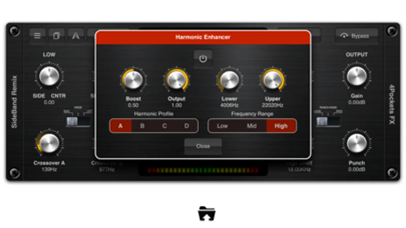 Audio can be additionally split into 3 channels, LOW, MID and HIGH frequency bands which are all processed separately and eventually re-combined after processing. This allows you to control the bass and treble portions of your mix separately from the mids where the vocals naturally sit. Being able to push content from the center of the mix opens up room for a vocal to sit comfortably. The punch knob can be used to boost low and high band content or presence, while the shelf filter are there to make sure they never get out of control. As if that wasn't enough you can enable the harmonic exciter to inject top end sparkle into the mix or enhance low end frequencies.