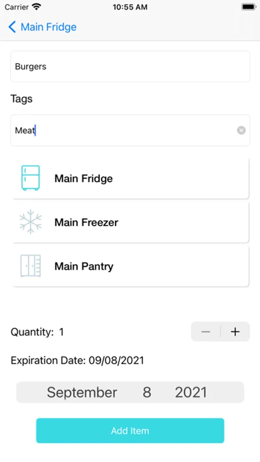 • Add food items with their expiration date to their location in organized lists