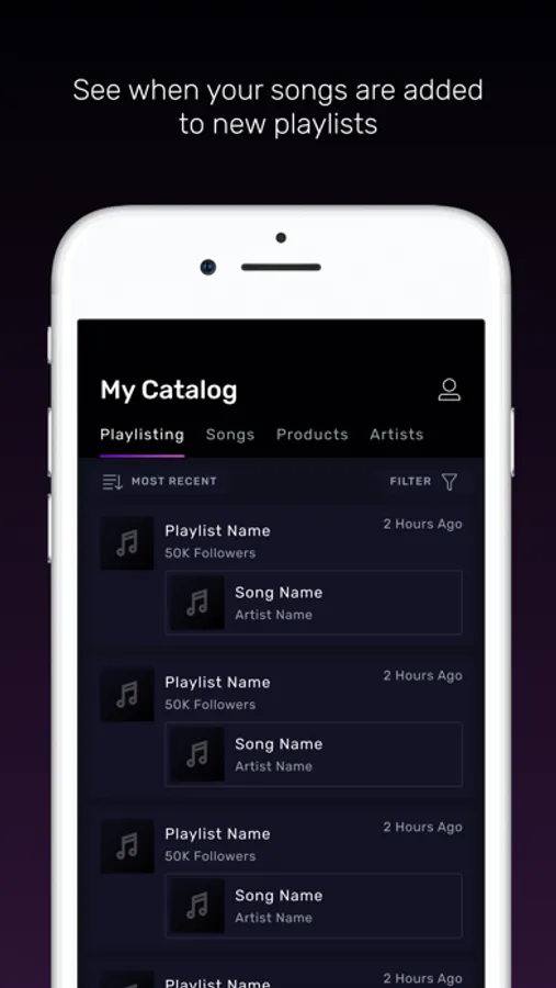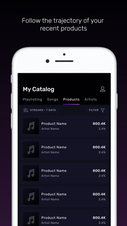 -View your Recent Products to monitor your performance across Spotify, Apple Music, Amazon Music & many more.