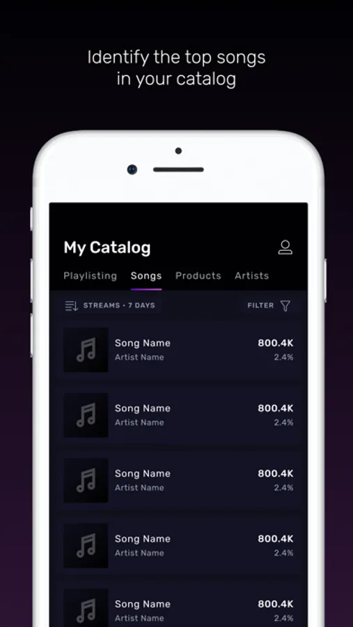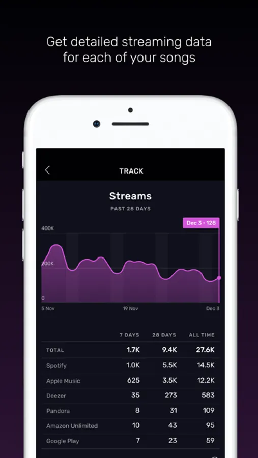 -Dive deeper to see Analytics like all-time streams, trends, playlist placements and more.