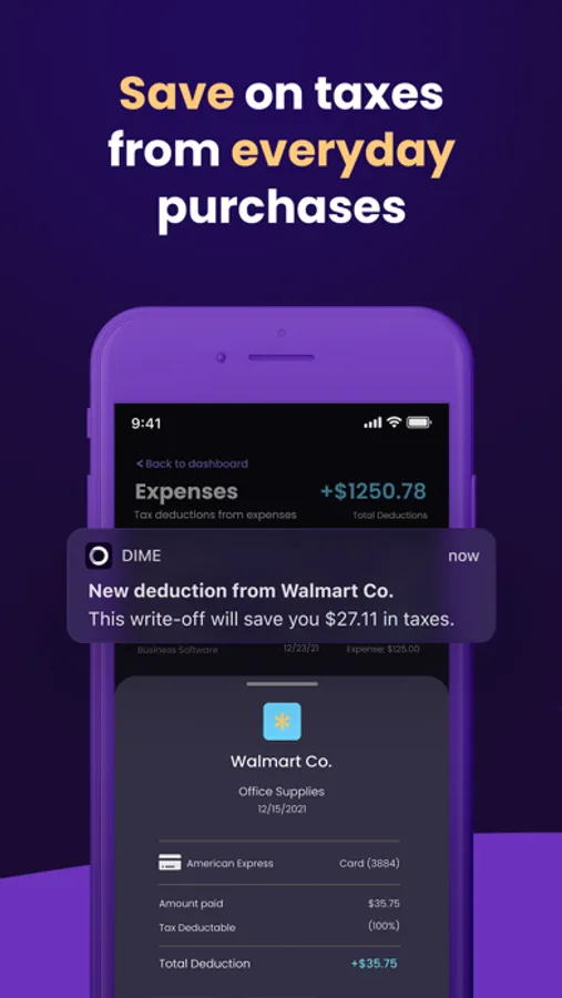 Dime is the all-in-one app for freelancers, contractors, and self-employed professionals. With Dime, you can keep track of your income and expenses, find tax write-offs from everyday purchases, and submit your taxes with ease.