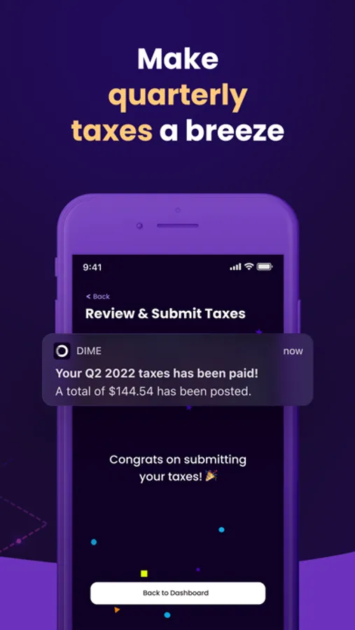 Whether you're just starting out on your own or have been self-employed for years, Dime makes it easy to manage your finances and stay in compliance with tax laws. So ditch the shoebox filled with receipts and download Dime today!