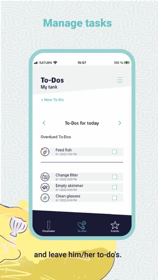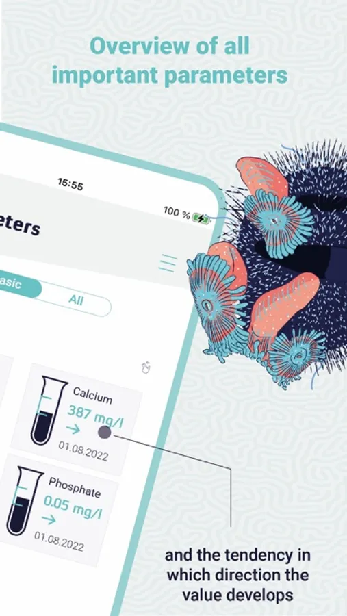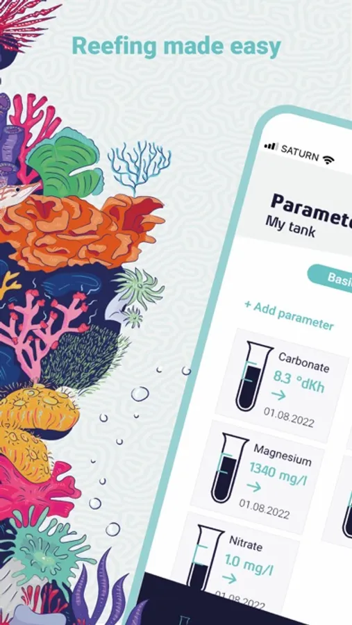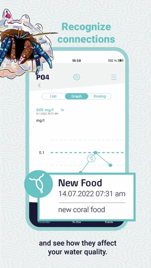 With Typus you can easily and quickly document your measured values. Typus provides you with a clear dashboard that allows you to keep track of your water quality at all times. The special feature of Typus? You can also enter events in your tank, for example new fish or coral stocking, but also incidents such as algae growth or the use of a new salt. This helps you to better understand and document the relationships in your aquarium. Typus also helps you to document your dosage of the individual elements, so that you can always keep an eye on everything concerning your water quality.