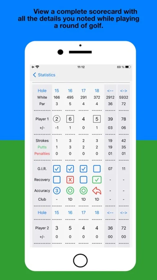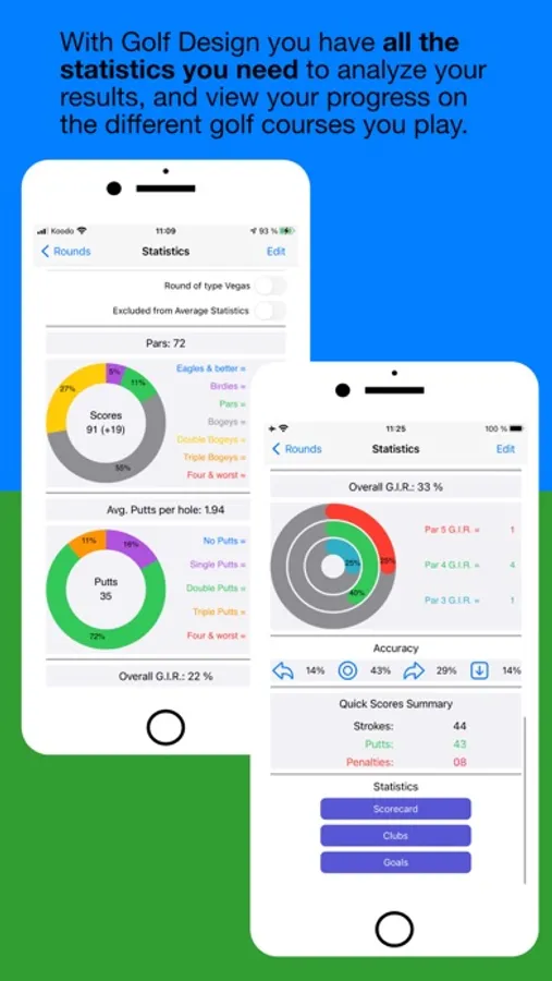 - Displays all the statistics and graphs you need to analyze your results, and view your progress on the different golf courses you play.