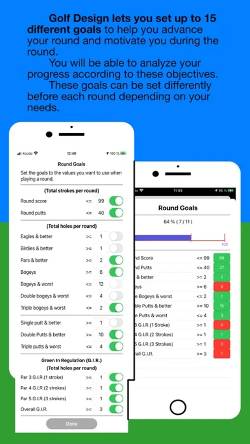 - Golf Design lets you set up to 15 different goals, to help you advance your round and motivate you during the round.
