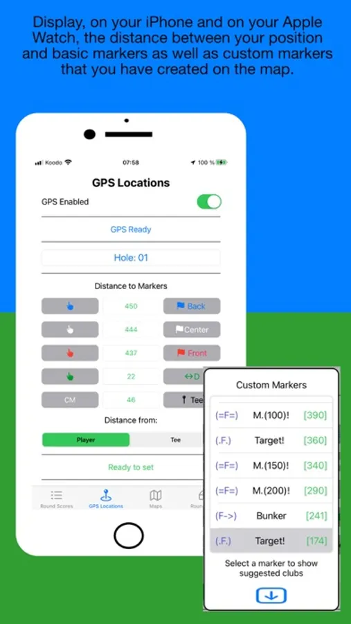 - Golf Design suggests you which club you can use to to reach the position of a marker you have selected on the map (on iPhone) or a position of a marker you selected in a list of markers (on iPhone or on Apple Watch).