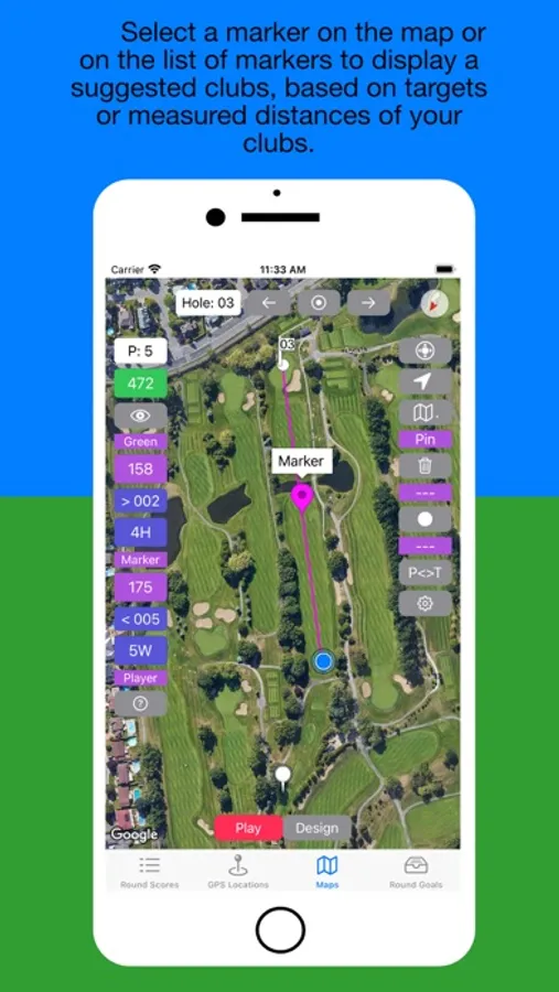 - Golf design then immediately displays the distances calculated by GPS from your position to the flag or marker you have placed on the map.