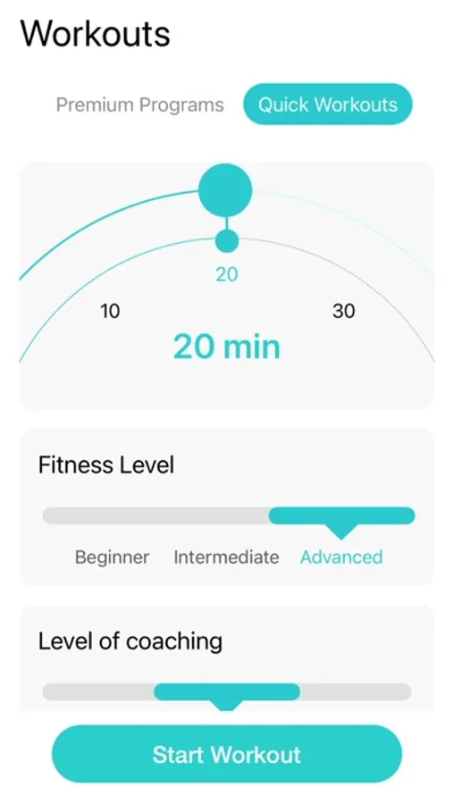 Build totally unique workouts in seconds. Select 10, 20, or 30 minutes, chose your fitness level, and pick the amount of coaching you want during your workout and let the custom algorithm build the perfect workout for you.