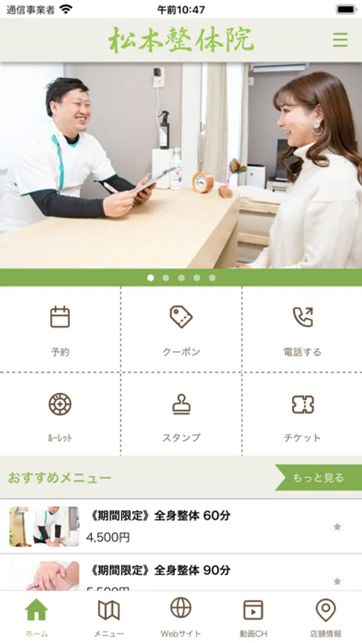 【松本整体院】の公式アプリが登場。アプリを通して【松本整体院】の新着情報やお得な情報をリアルタイムで受け取ることができます。また、いつでもお手元のスマートフォンから、メニュー、ご希望のお時間帯のチェック・ご予約などが可能です。アプリをインストールしていただくことにより【松本整体院】を、より便利に身近にご利用していただけます。