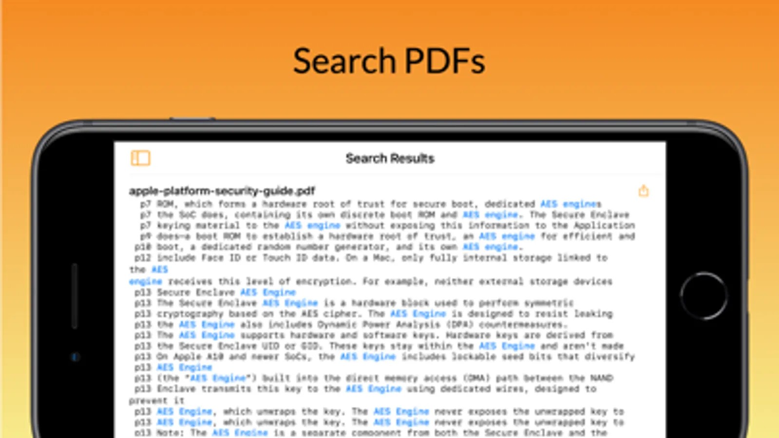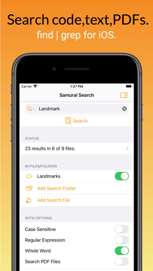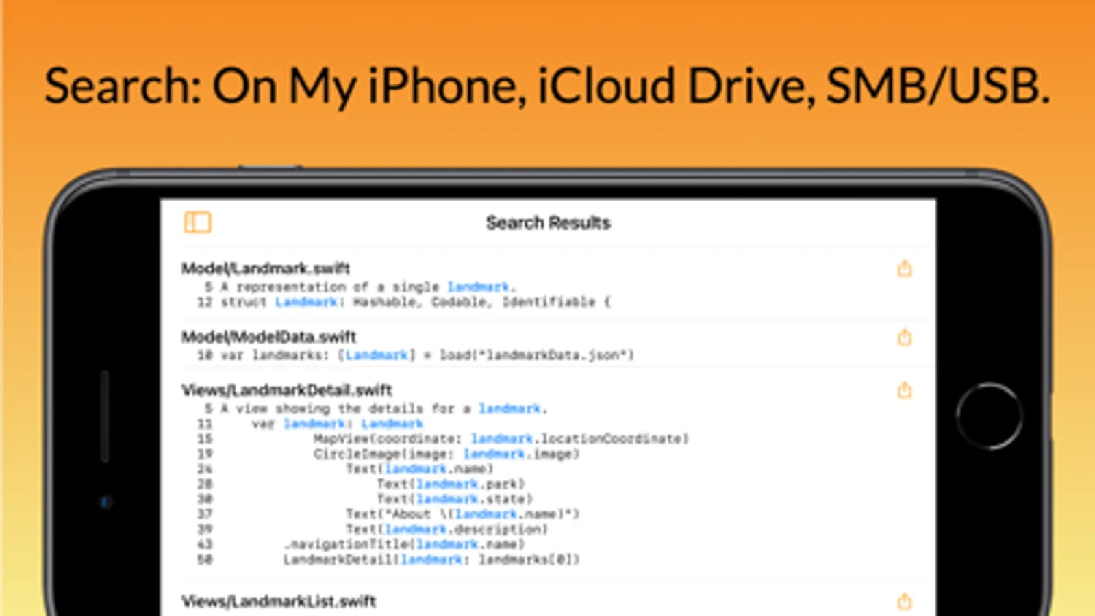 Search source code, plain text files and PDF files on your iOS device or in iCloud/USB/SMB, then open matched files in your favourite editing/viewing app.