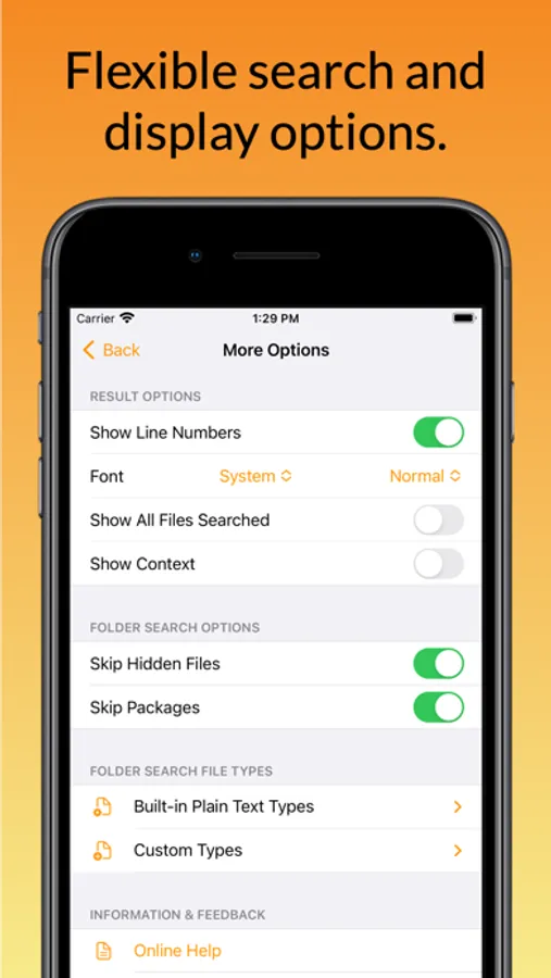 Supports flexible search options, including regular expressions (for plain text files). Files searched can be selected from standard or custom text file types.
