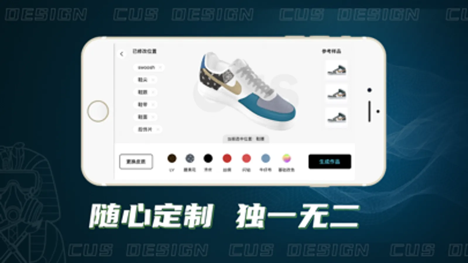 CUS球鞋定制是一款专为球鞋定制打造的App, 在这里你可以尽情发挥自己想象,在线设计专属于自己的潮鞋