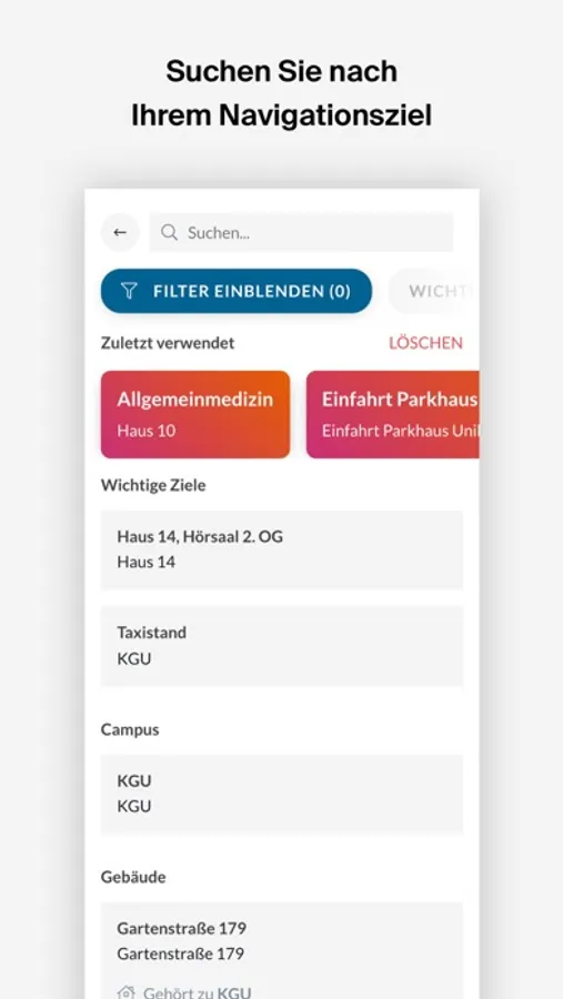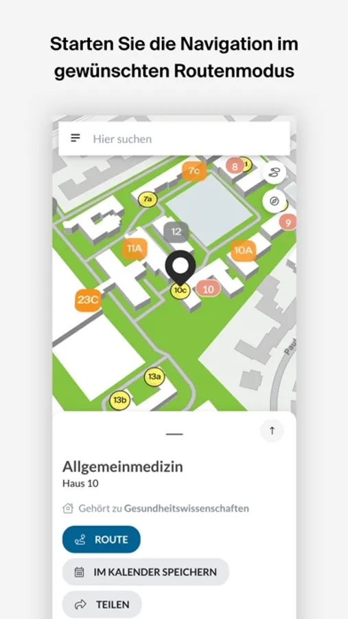 nutzen Sie unseren interaktiven Lageplan, um sich auf unserem Campus und unserem Gelände zurechtzufinden. Navigieren Sie mit unserer App von Ihrer Haustür zu Ihrem Terminort - wenn Sie möchten mit Zwischenstopp am Parkhaus. Außerdem können Sie sich über aktuelle Veranstaltungen und Neuigkeiten informieren.