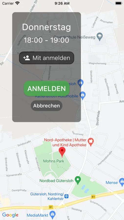 Außerdem kannst du dich hier zu Terminen anmelden und erhältst eine Nachricht, falls der Termin abgesagt werden muss oder es andere Infos zu einem Termin gibt.