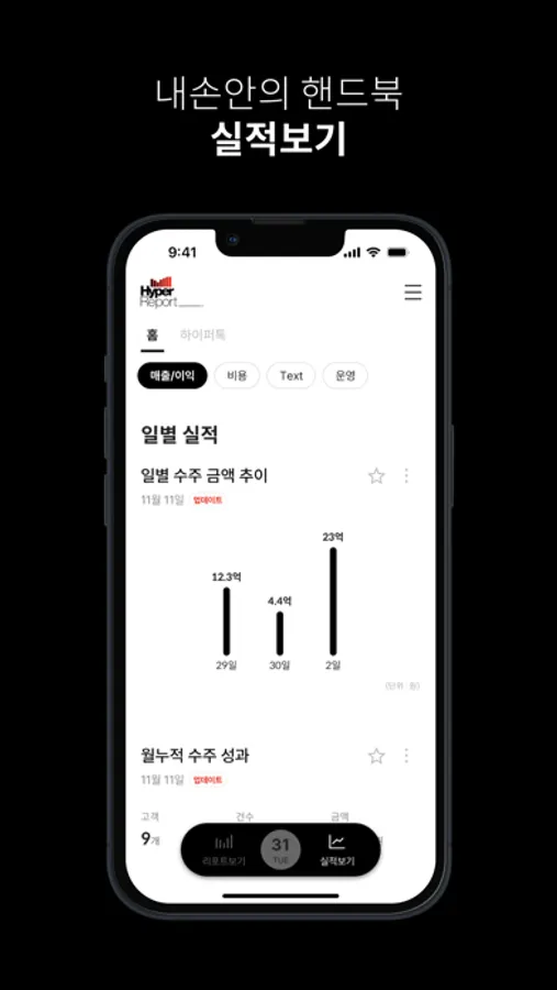 ● 실적보기 : 핵심 실적지표를 일, 주, 월, 분기별로 정리하여 handbook처럼 제공합니다.