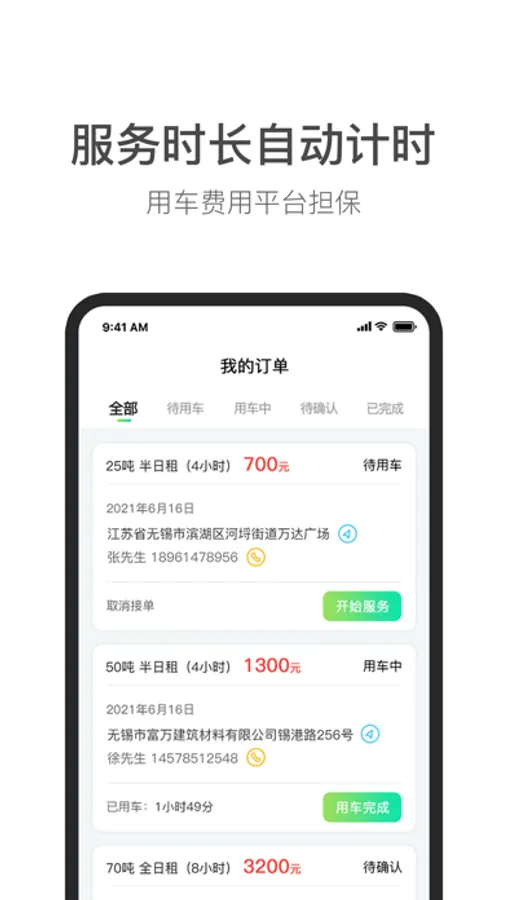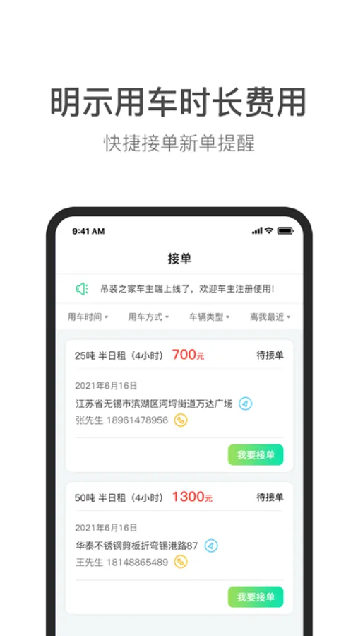 车主登录或者注册后可以查看所有用户发布的未接单的用车订单。车主接单后按照规定时间提供订单所需的吊车,并开始计时。车主点击用车完成后开始结算所需费用,车主可提现账户余额。