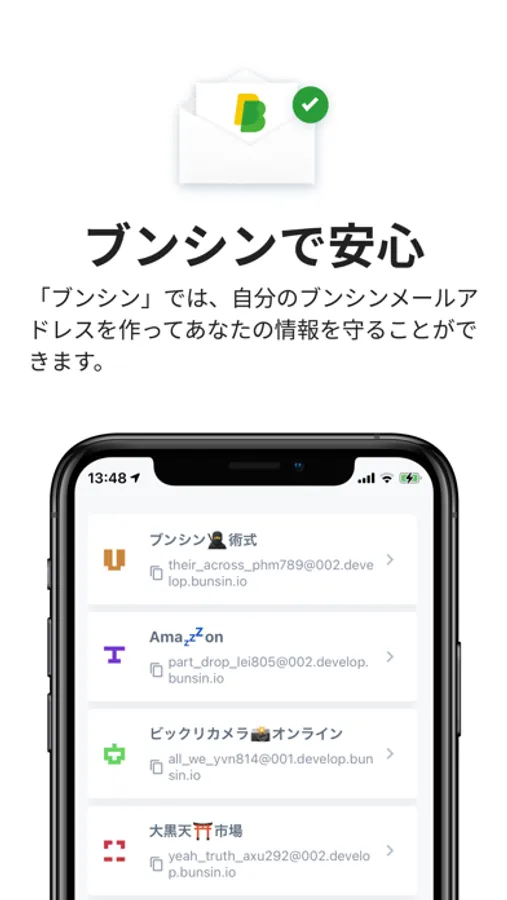 ブンシンを使えば、自分のメールアドレスに転送される、新たなメールアドレス(ブンシンメール)をいくつも発行できます。