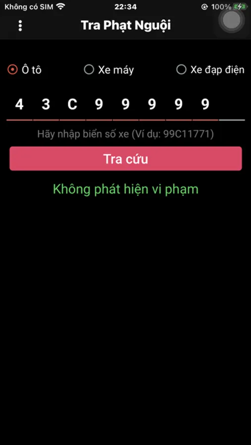 Enter the vehicle registration plate in the input box, for example: 43C99999.