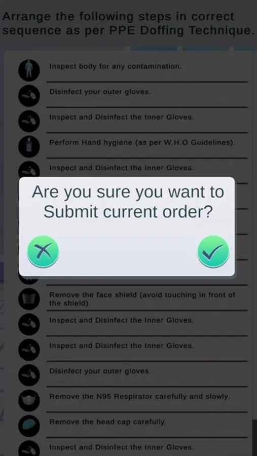 pick the correct item, likewise, the player learns the correct steps. After every step of donning, a questionnaire will follow, which will help the player memorize the steps easily.