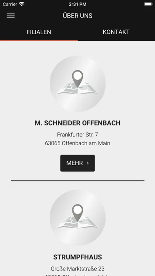 7. Über uns: Welche Filiale hat wann geöffnet? In der App steht alles drin. Ein Blick auf die Map verrät Ihnen außerdem, wie Sie am besten zu uns fahren.