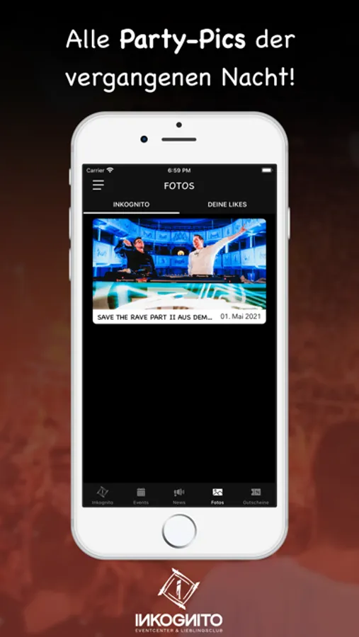 Du erfährst als erster, wann die nächste Party steigt und profitierst dabei noch von fetten Aktionen. Zum Event sparst du mit unseren Gutscheinen bares Geld. Damit du dich am Tag danach auch an den geilen Abend erinnern kannst, stellen wir alle Party-Pics in der App bereit.