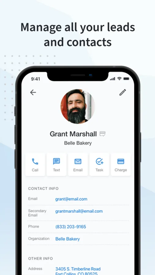 The Marketing 360 App CRM gives you access to all of your leads, customers and contacts, right in your pocket. Plus, you can call, text, email or charge a contact with just a few taps.