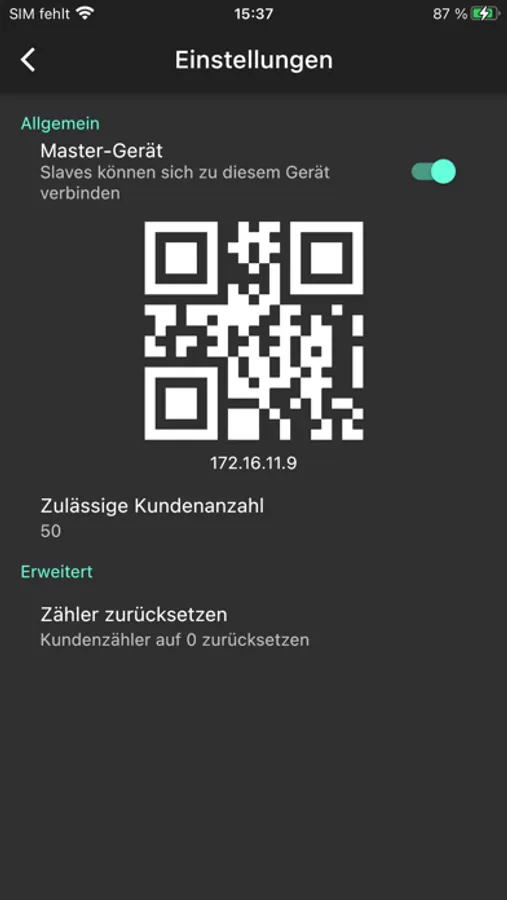 Master-Slave mode for local networks: This mode is for stores with several entrances and exits. Within this mode, several devices connect via an existing Wi-Fi network. After defining a master device, further devices can be connected via QR Code. The master device synchronizes its count with all connected devices. If the allowed number of customers is reached or exceeded, all devices will be alerted.