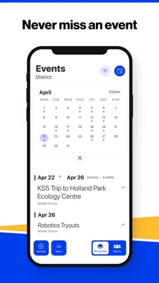 The event section shows a list of events throughout the district. Users can add an event to your calendar to share the event with friends and family with one tap.