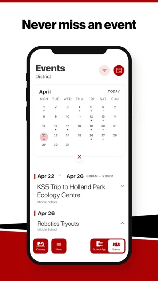The event section shows a list of events throughout the district. Users can add an event to their calendar to share the event with friends and family with one tap.