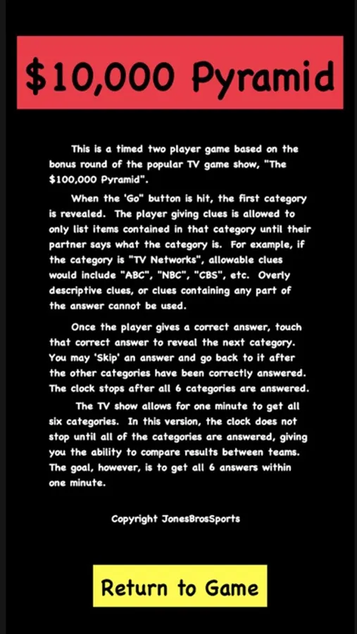This is a timed two player game based on the Winners Circle Round of the popular TV game show, "The $100,000 Pyramid". One player lists items from each given category until the second player guesses the category. The objective is to guess all 6 categories in under a minute.