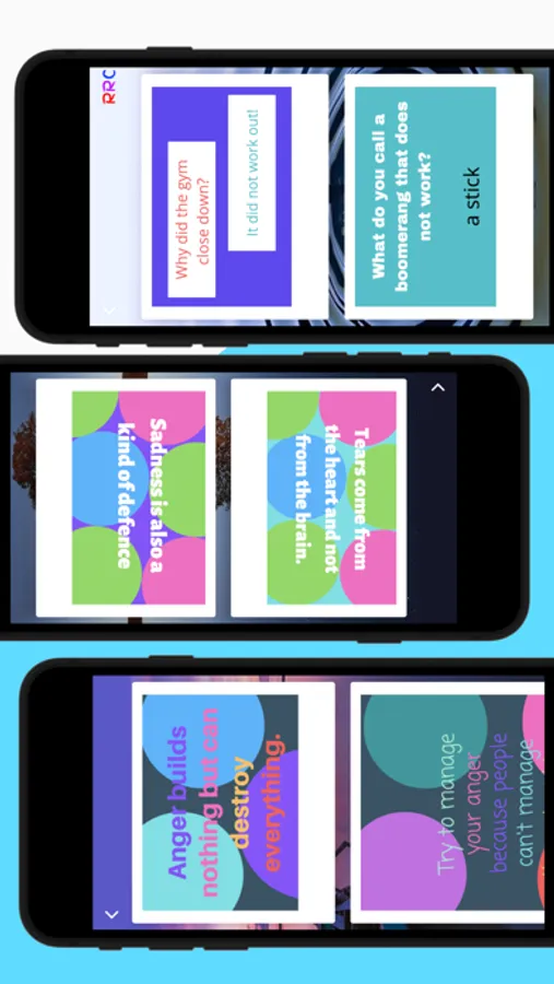 3R is the app that will help you reset your feelings, relax your mind with jokes and quotes and rejuvenate with activities and the bucket list. Our helpline resources will give you the contacts you may need when you are not at your best and they will help you get back on track. Use the bucket list to store your dreams so you can work your way to achieve them gradually. Activities will let you find something to do when you are board or need something to do.  All of our pages are updated daily and will keep you going.