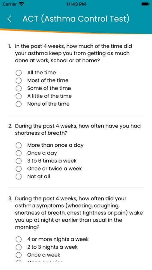 The officially licensed Asthma Control Test (ACT) is available in the App according to the user. Additionally, the in-app log makes it easy for users to track their medications, symptoms, and activities for future reference.