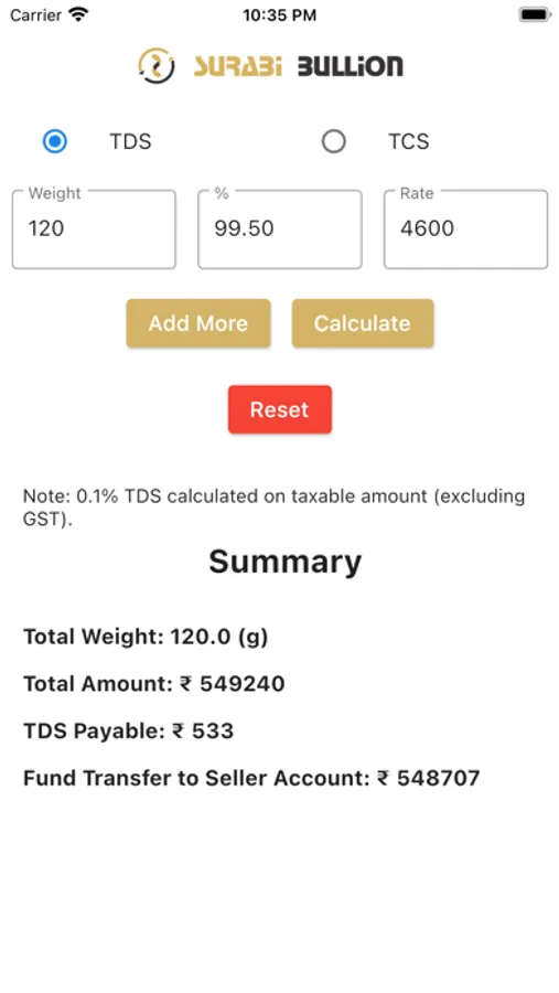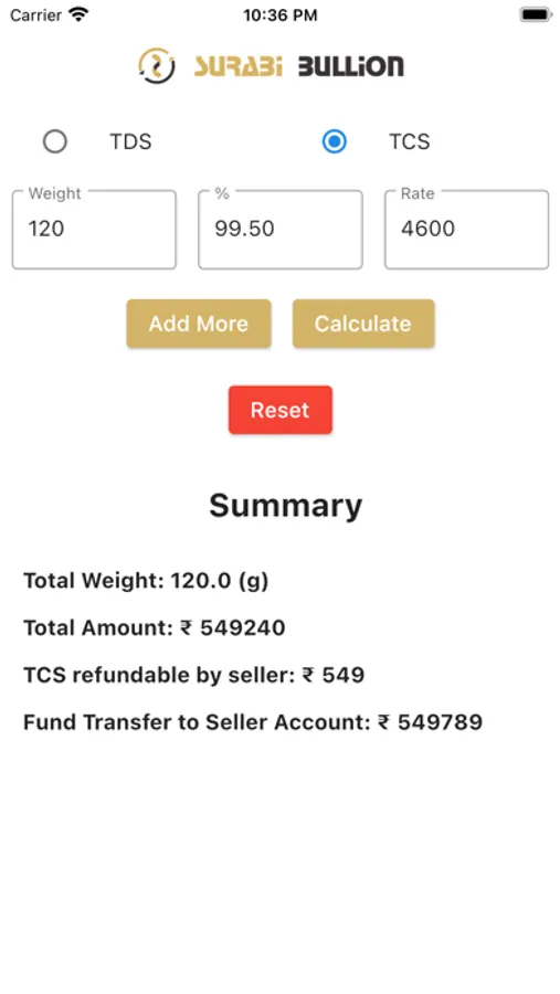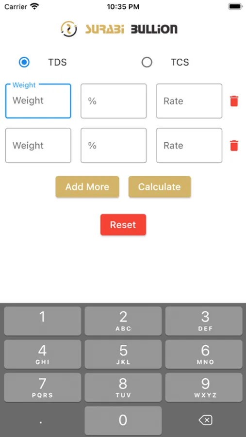 - TDS and TCS can be calculated by entering Rate, %, and weight.