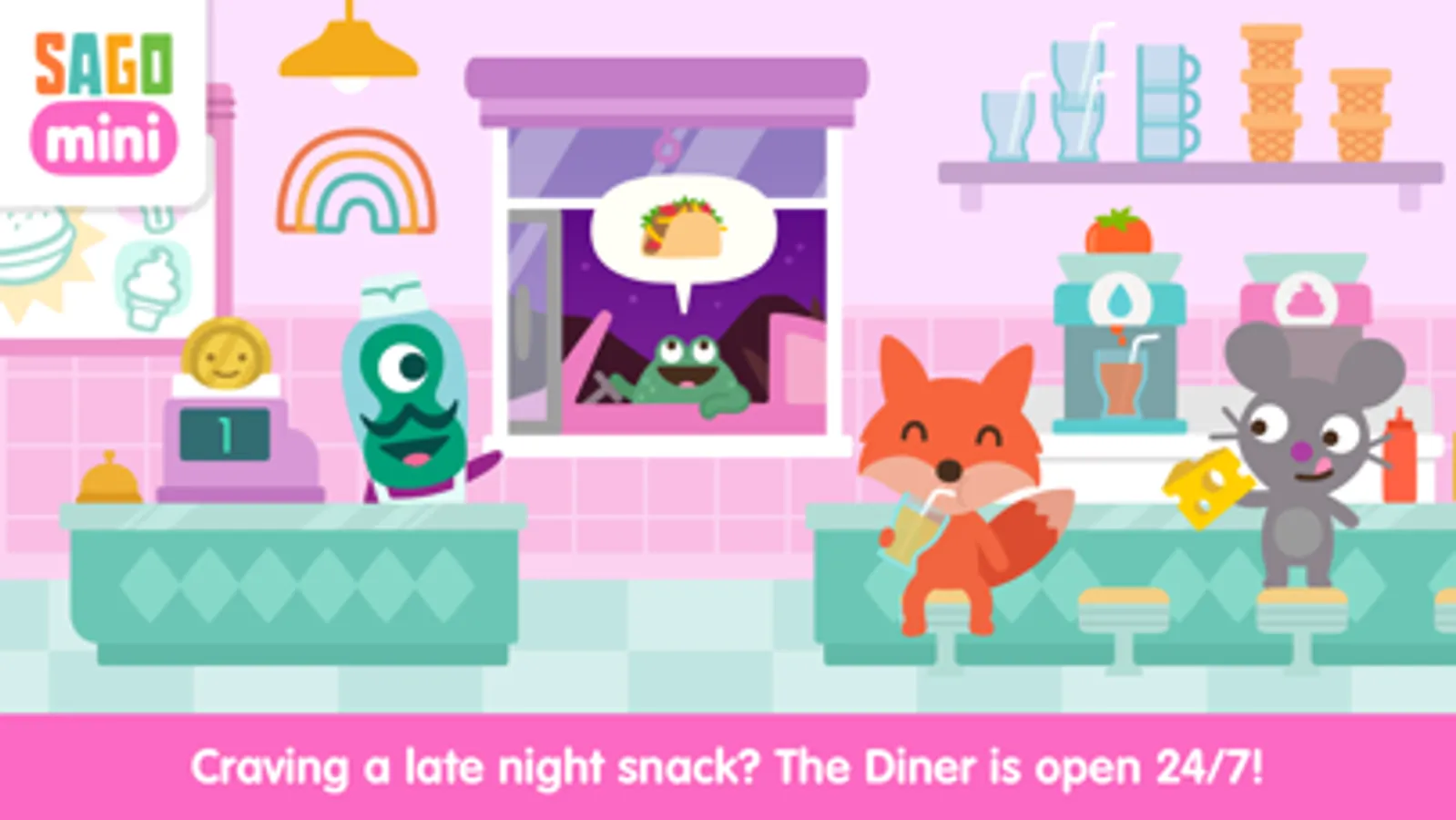 Explore the diner for some hidden surprises and new friends! Who's hiding in the toilet? Craving a late night snack? The Sago Mini Diner is open 24/7!