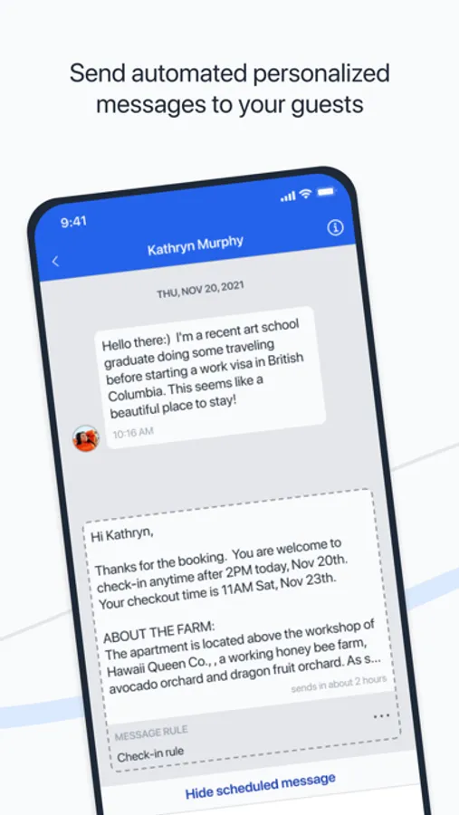 - Send automated customized messages via the channel's messaging system. Your guests will never know your messages are automated.