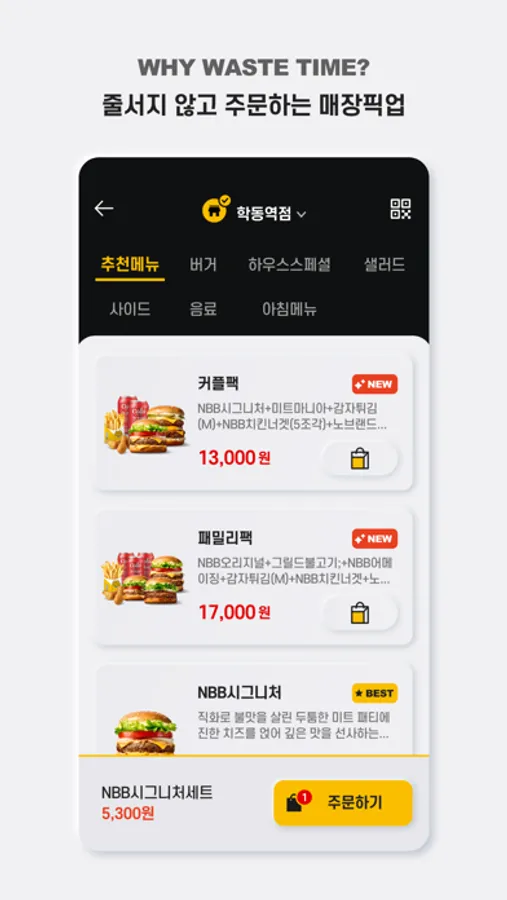 인근매장을 설정하고 미리 주문하시면 도착하자마자 조리된 버거를 만나실 수 있답니다.