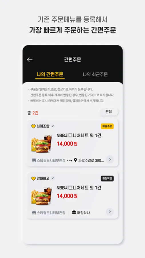 즐겨먹는 메뉴와 자주가는 매장을 설정하고 클릭 한 번으로 장바구니까지.