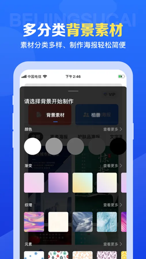 We support colors, gradients, textures, and selecting backgrounds from photo albums to make posters;