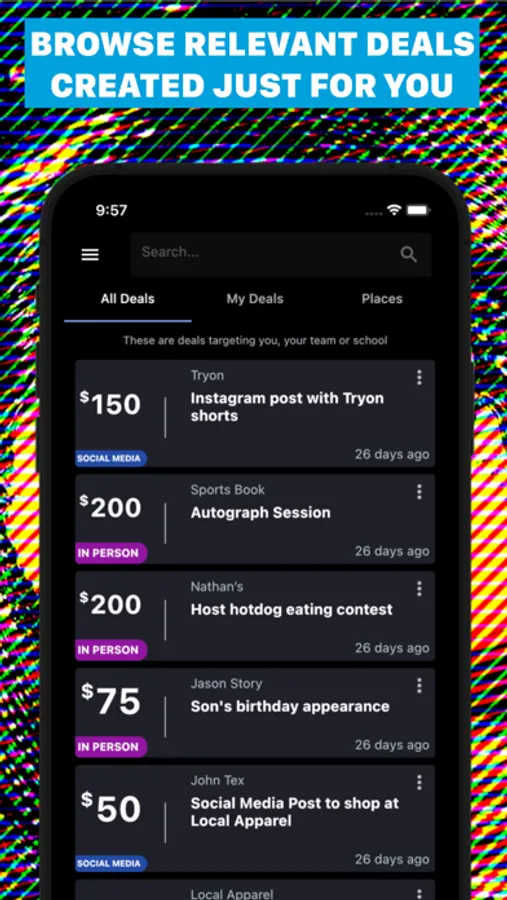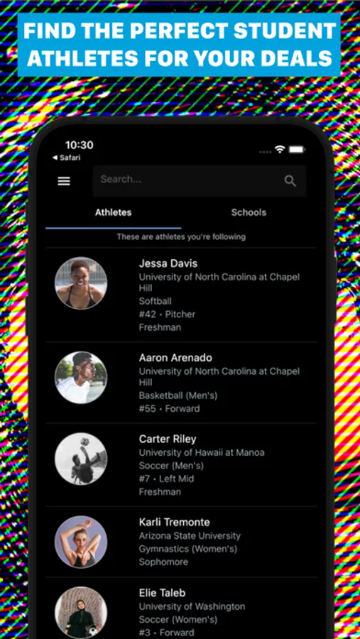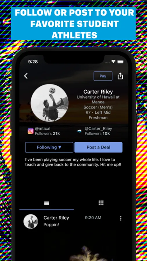 If you're a brand, fan or business, it's simple! You can post a deal (e.g. "In Person Autograph Session", "Instagram Post for your Business", etc) to any NCAA school, team and/or individual student athlete, set your price, then sit back and wait for a response. We'll do the rest.