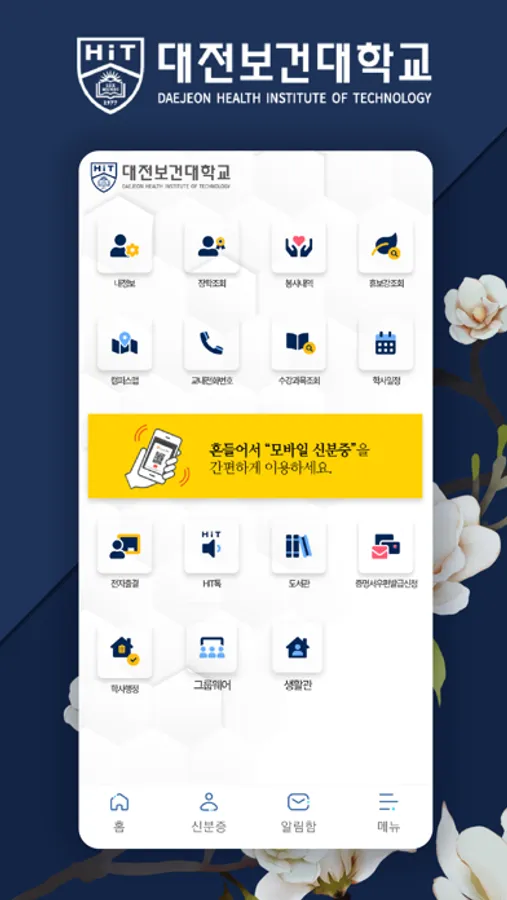 대전보건대학교 모바일포탈 앱입니다. 기존에 별도로 분리되어 있던 모바일 신분증을 통합하였습니다.
