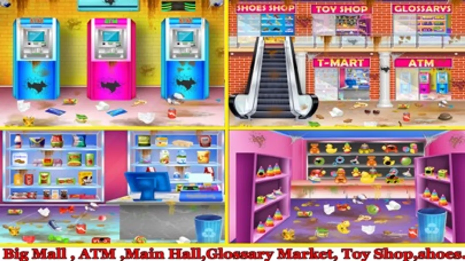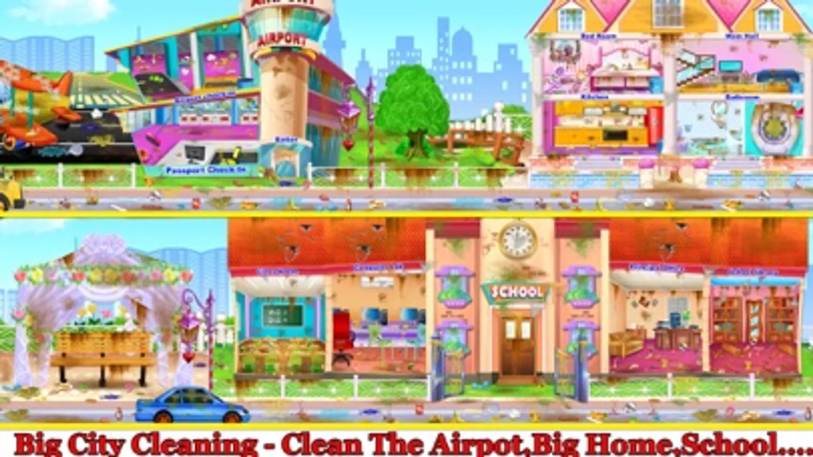 This is a excellent collection of cleanup games with plenty of public places levels like airport, hospital, malls, schools, park, hotel, house which include many principal things to teach kids how to make their home and city neat & clean. Let's play the most impressive educational cleaning kids game where all age people can learn something new every time about housekeeping skills. This Game Include Many public places of your city as described below.