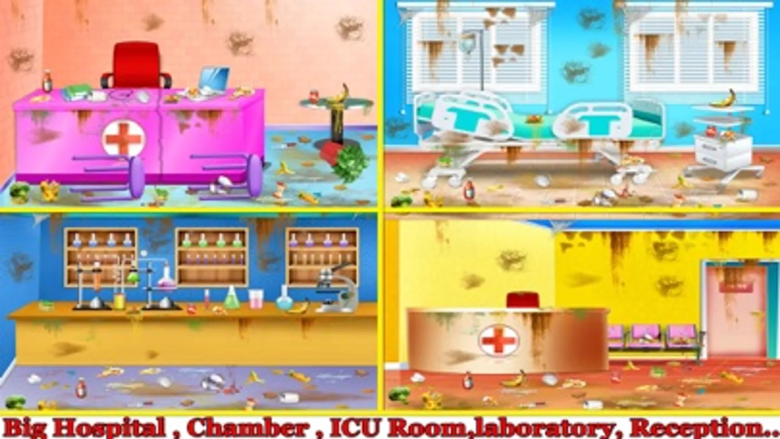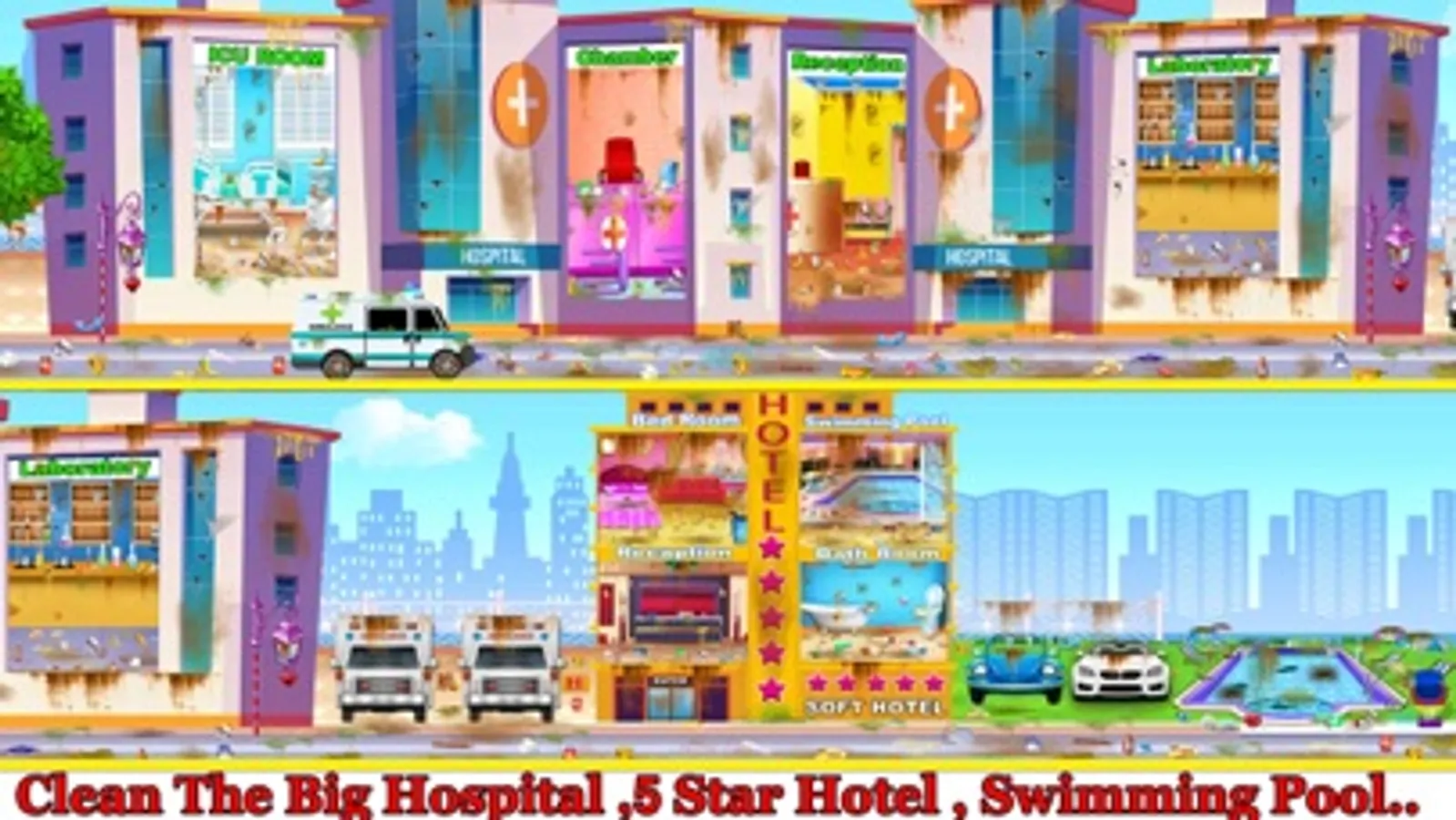 Make the all rooms clean, hygiene in hospital cleaning! Be a cleaning expert and cleanup the hospital before all the doctor’s hospital staff and patients arrive.