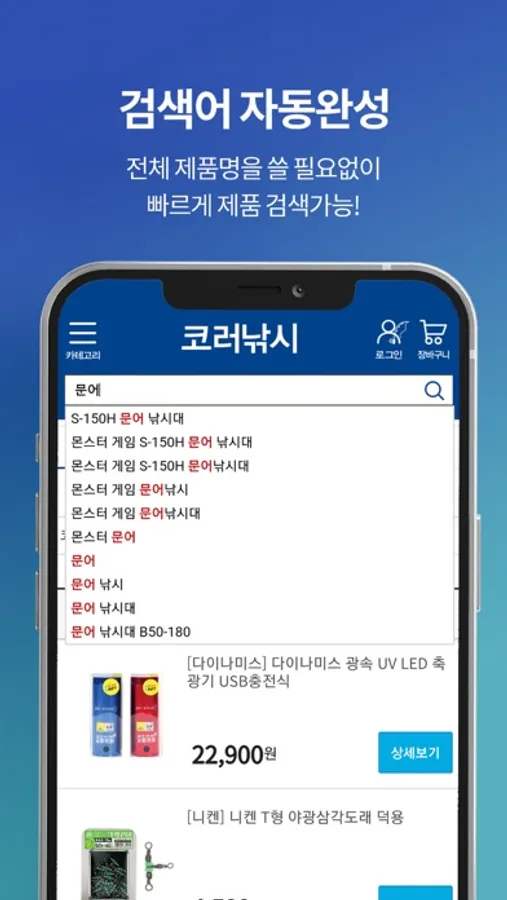 한 단어만 입력 하더라도 자동완성기능이 있어 빠르고 간편하게 고객님이 원하는 제품을 찾아드립니다.