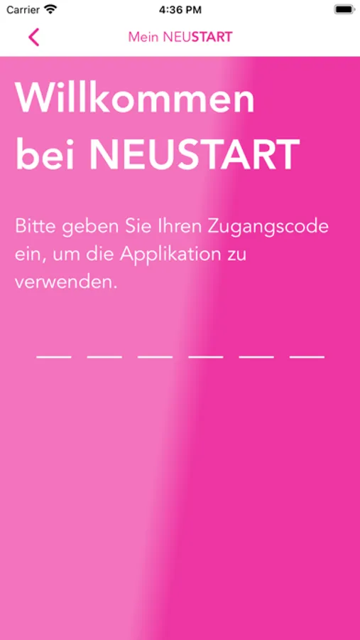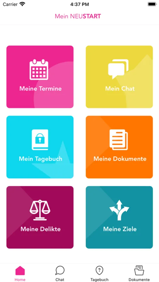 Die NEUSTART App beinhaltet einen öffentlichen Bereich mit Informationen zu NEUSTART und Verlinkungen zur Website, sowie einen internen Bereich für Klientinnen und Klienten.
