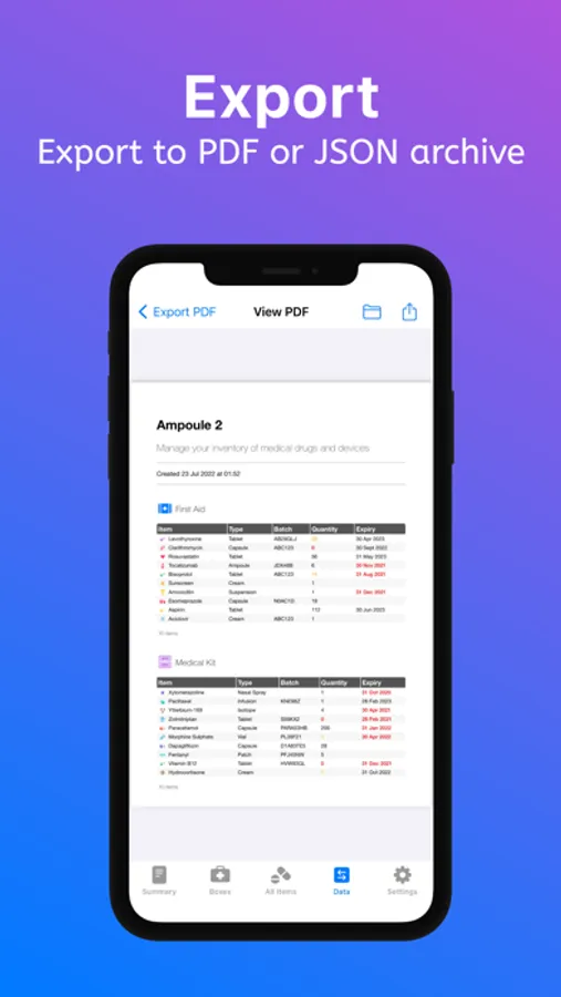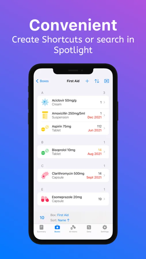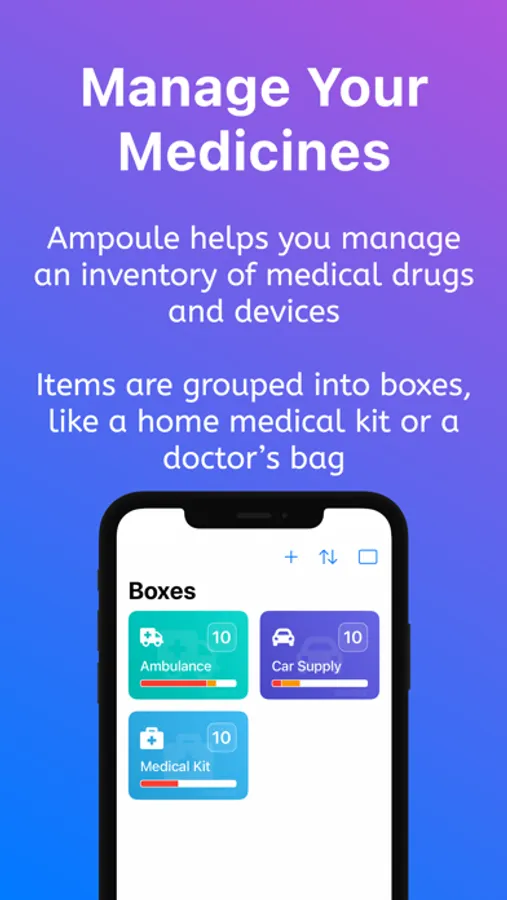 Whether a home first aid kit, doctor's bag, medical clinic or pharmacy, Ampoule will help you manage your medicines. Organise your items into as many boxes as you need, which could represent different types of drugs, individual people or separate locations.