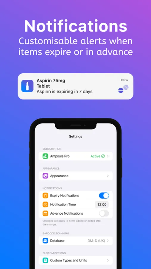 Items are highly customisable, with data fields including name, strength, batch number, quantity, expiry date and notes. You can create custom types, units and tags and choose from a range of icons and colours. Items that have low stock or nearing expiration are highlighted, with the option to receive notifications for items expiring soon.
