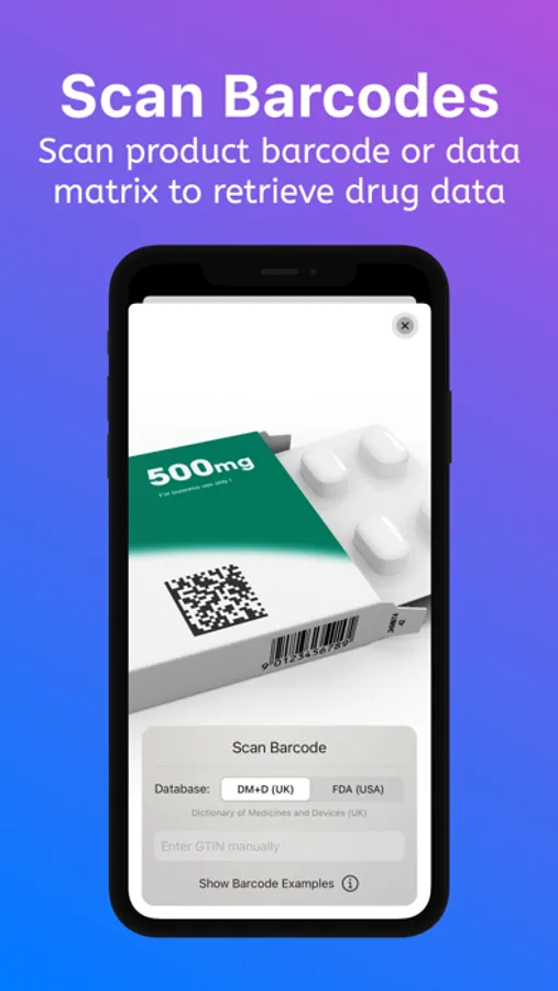 Scan a pack barcode or data matrix to retrieve drug data automatically.