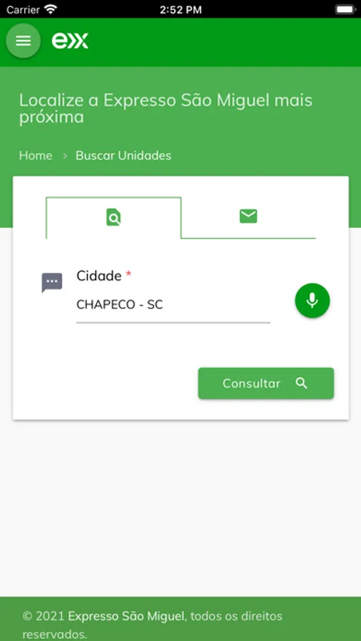 - Buscar maiores informações sobre a unidade da Expresso São Miguel que atende a sua localidade (endereço, telefone de contato, e-mail e frequência de atendimento de coleta e entrega), através do ícone “Buscar Unidades”;