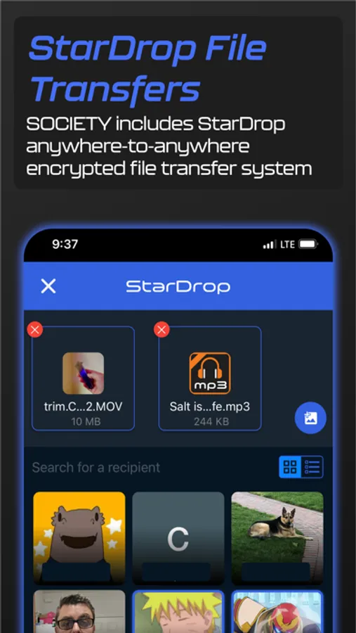 NEW: Introducing StarDrop, SOCIETY's encrypted file transfer. Drop files anywhere in the world to any of you SOCIETY connections on any mobile platform. Anything sent over SOCIETY StarDrop is fully end-to-end encrypted, making it easy to move files securely. File transfer can be paused and resumed, so you do not have to restart a transfer, it will complete in the background.