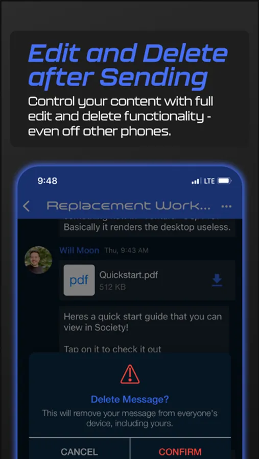 OWN YOUR CONTENT: On SOCIETY you own your data. That means you have the power to edit and delete sent messages at all times on all phones, prevent forwarding of your chats to unwanted people, and you control who sees your content.